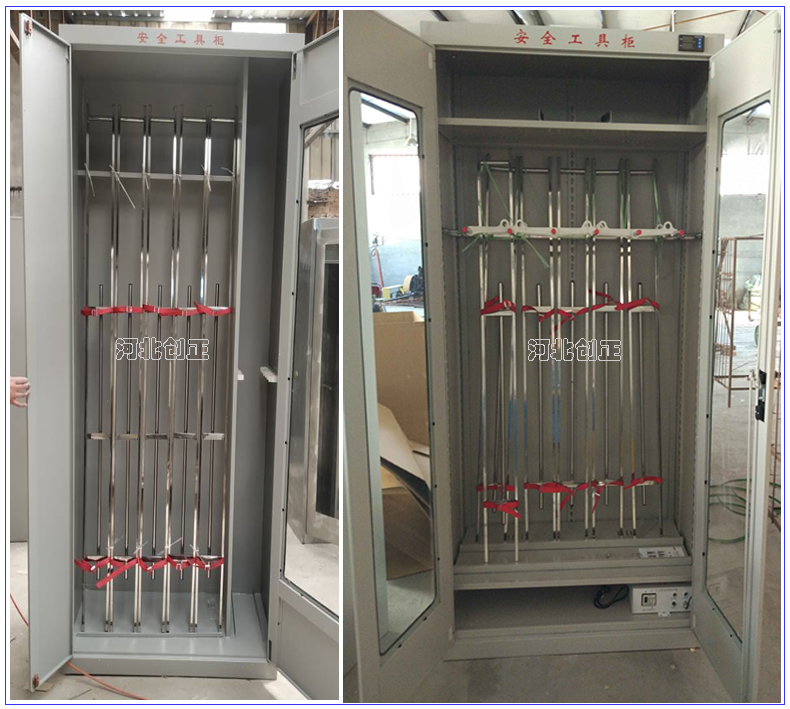 2、智能型安全工具柜裝有溫濕度顯示表和控制操作面板,顯示溫濕度和設備運行狀態。柜底可選擇安裝萬向輪和定位螺桿;柜頂可選擇安裝吊杯,方便運輸。應用于不同溫濕度地區的不同電壓等級的變電站、集控站、線路工區以及電力公司等單位。