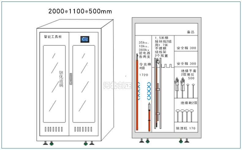 2、智能型安全工具柜裝有溫濕度顯示表和控制操作面板,顯示溫濕度和設備運行狀態(tài)。柜底可選擇安裝萬向輪和定位螺桿;柜頂可選擇安裝吊杯,方便運輸。應用于不同溫濕度地區(qū)的不同電壓等級的變電站、集控站、線路工區(qū)以及電力公司等單位。